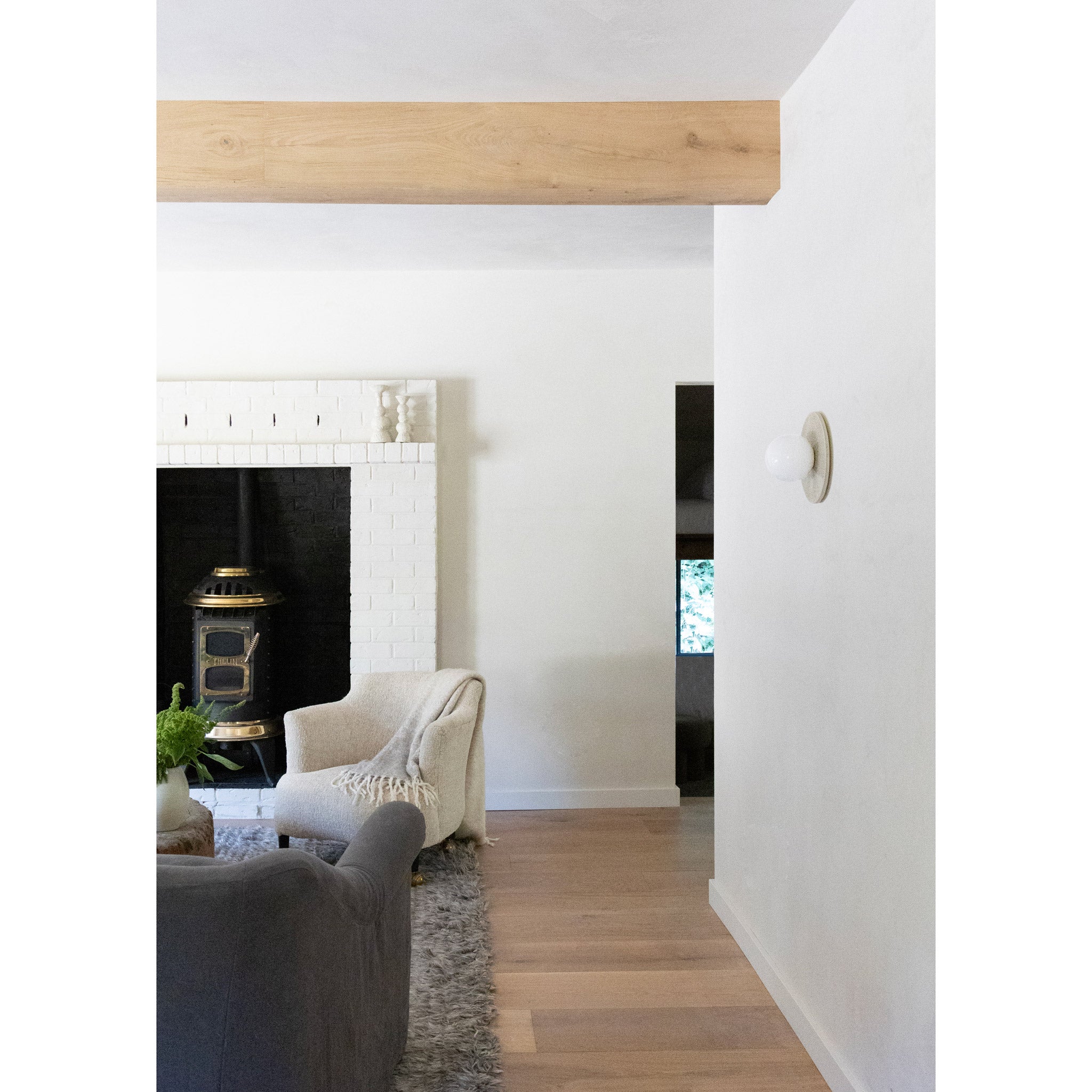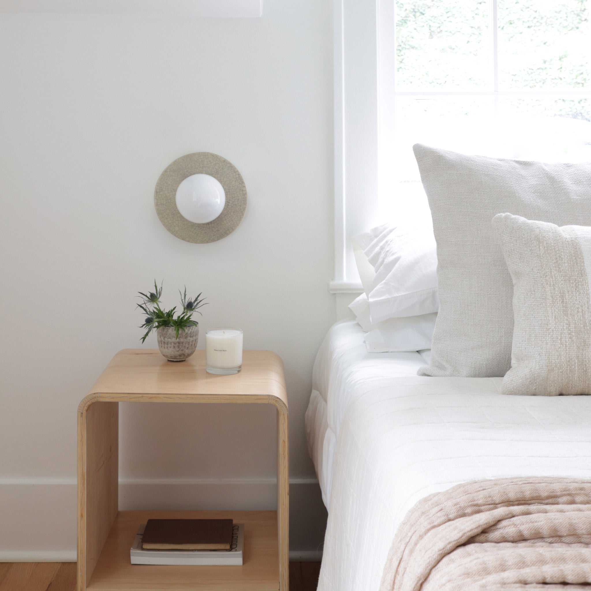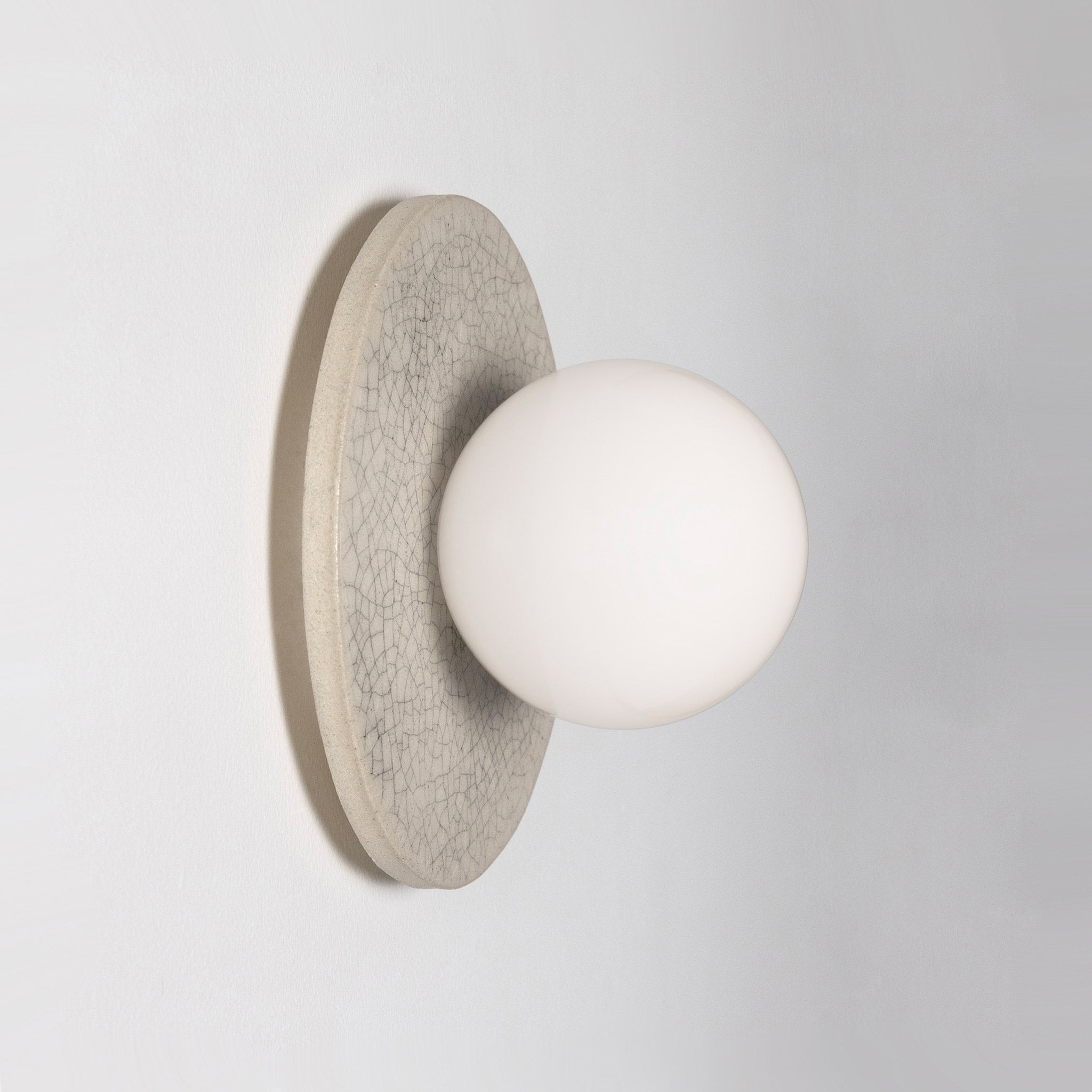 Kalpana Moon Sconce features a handcrafted ceramic backplate framing a full moon glass globe. From modern to traditional interiors, this light's depth of character is a lovely example of quiet luxury.
